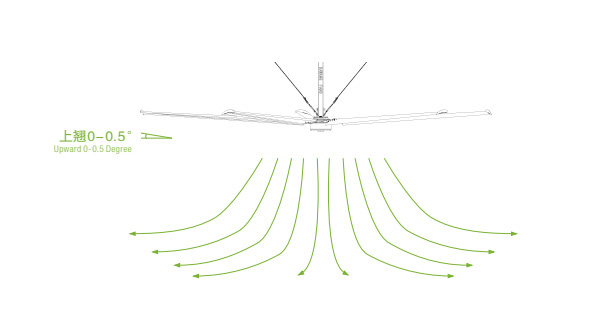 0-0.5° 微上揚(yáng)—緩沖腔內(nèi)設(shè)有精確角度限位,葉柄與緩沖腔連接后形成0-1.5°微上揚(yáng),有效消除風(fēng)扇運(yùn)行過程中產(chǎn)生的反向作用力,并形成錐形氣流,實(shí)現(xiàn)中心無空洞且增加覆蓋范圍。