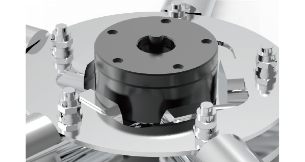 通過上下壓盤與葉柄凹凸臺階的相互咬合,使得葉柄與輪轂/電機(jī)形成一體,運(yùn)用整體結(jié)構(gòu)來承受風(fēng)扇運(yùn)行時(shí)的離心力,所有緊固件不受力。
