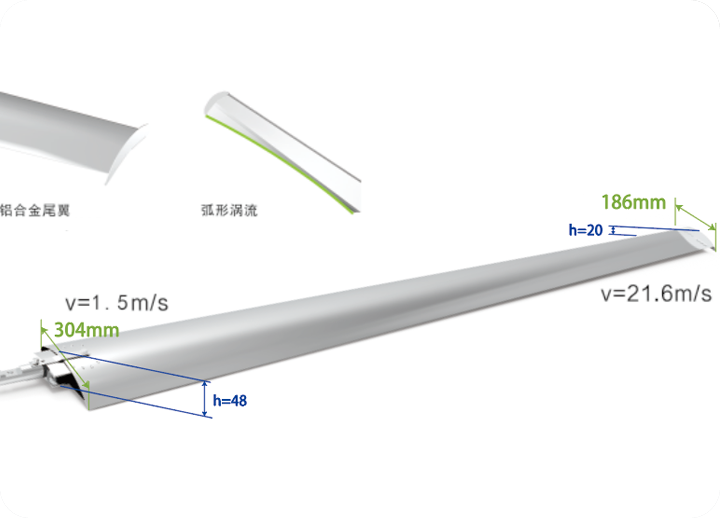 應用空氣動力學等弦長理論,結合相對線速度原理,葉根到葉尖逐漸變窄(304-186mm)、變薄(43mm-21mm),受力更平衡,送風更均勻,且中心無空洞。