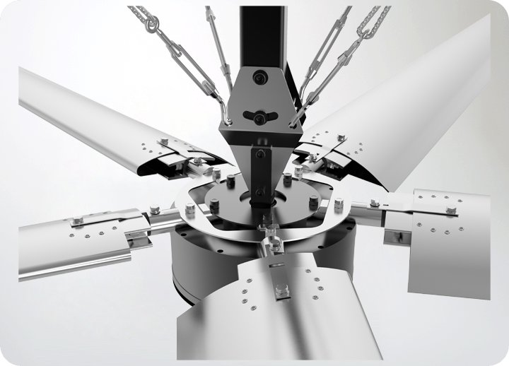 葉柄采用6061T6航空級鋁合金,整體包裹PU聚氨酯與葉片緩沖腔體緊密配合,高效釋放葉片轉動所產生的振動和應力,消除共振。